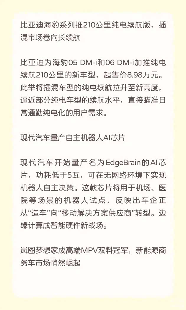 比亚迪海豹推210公里纯电版,现代量产AI芯片,岚图MPV销量双冠,小鹏四款新车续航破千,车企密集降价促销