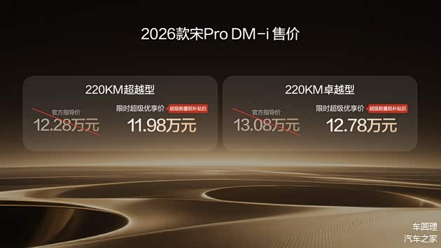 2026年1月10日,比亚迪正式宣布2026款宋Pro DM-i上新220km长续航版本,全系限时超级优享价9.98-12.78万元。