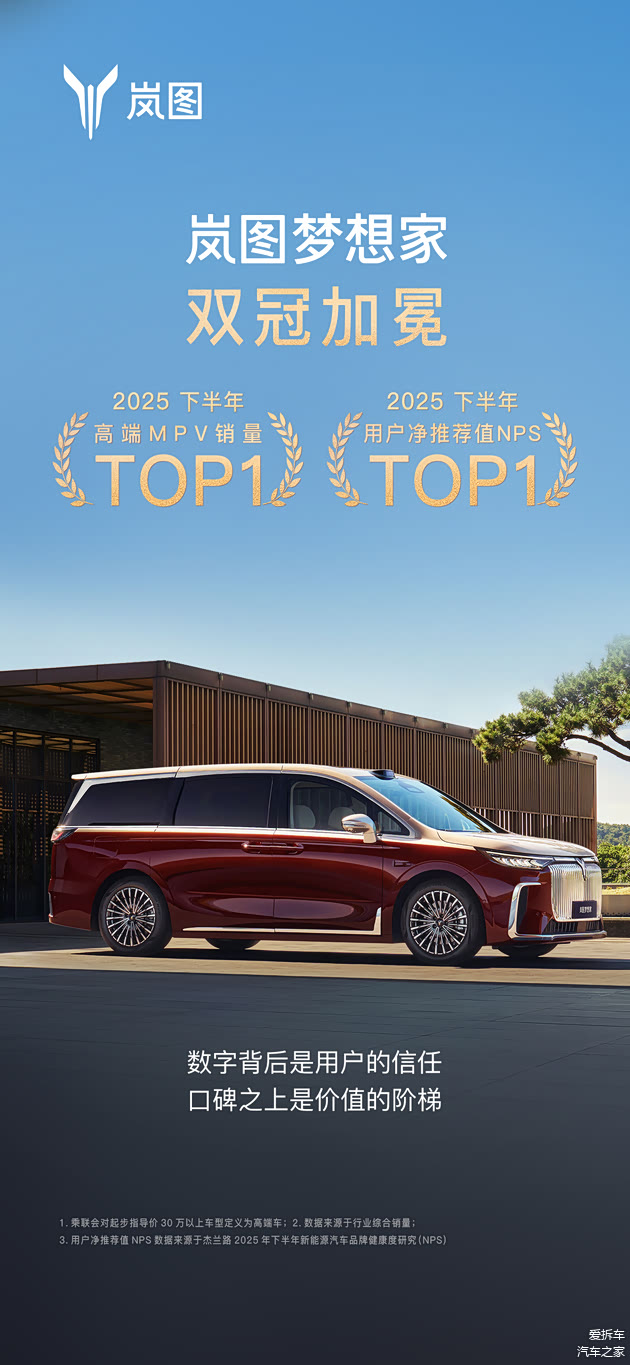 1月10日数据显示,岚图梦想家在2025年下半年销量为43191台,再次蝉联高端MPV第一,2025全年达到80248台,同比增长46%。另据杰兰路发布的《2025年度下半年新能源汽车品牌健康度研究(NPS篇)》,岚图梦想家在2025年下半年以78.5分的净推荐值(NPS)位居新能源MPV榜首。作为豪华旗舰MPV,岚图梦想家在2024年、2025年连续蝉联MPV用户净推荐值第一,成为销量与口碑的“双料冠军”,持续引领中国高端MPV。
