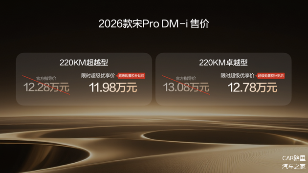 在家用SUV这个市场板块中,可选项有很多。而比亚迪宋家族在这片市场红海中,已收获超380万用户的信赖与热爱,树立了新能源时代SUV的价值标杆。就在今日(1月10日),比亚迪正式宣布2026款宋Pro DM-i上新220km长续航版本,全系限时超级优享价9.98-12.78万元。