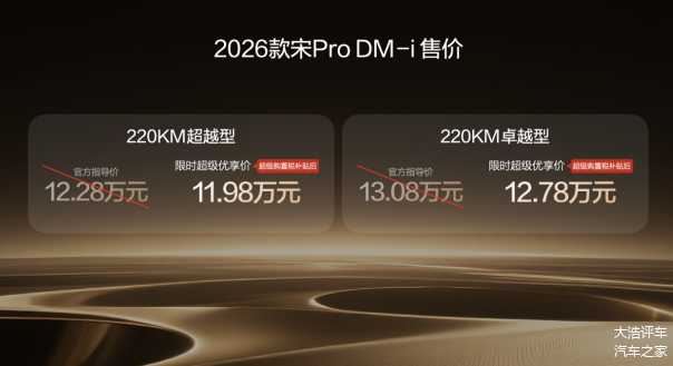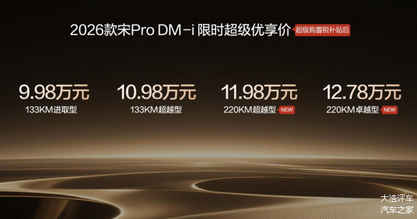 2026年1月10日,比亚迪2026款宋Pro DM-i长续航220km版本正式上市,全系限时价9.98-12.78万元。