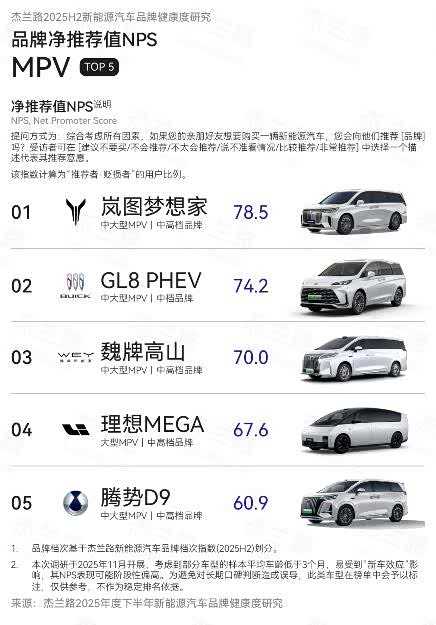 1月10日数据显示,岚图梦想家在2025年下半年销量为43191台,再次蝉联高端MPV第一,2025全年达到80248台,同比增长46%。另据杰兰路发布的《2025年度下半年新能源汽车品牌健康度研究(NPS篇)》,岚图梦想家在2025年下半年以78.5分的净推荐值(NPS)位居新能源MPV榜首。作为豪华旗舰MPV,岚图梦想家在2024年、2025年连续蝉联MPV用户净推荐值第一,成为销量与口碑的“双料冠军”,持续引领中国高端MPV。