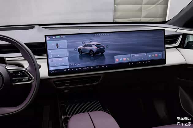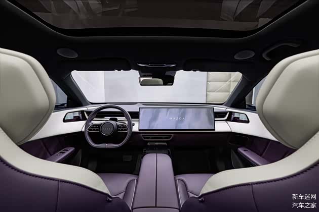 进入车内,CX-6e的内饰设计同样充满了未来感。车内配备了一块巨大的26英寸显示屏,几乎贯穿了整个中控台。此外,车内还配备了抬头显示系统,取消了传统的仪表盘。其他科技配置还包括手势控制快捷键、头枕内置扬声器,以及嵌入门板的电子后视镜显示屏。