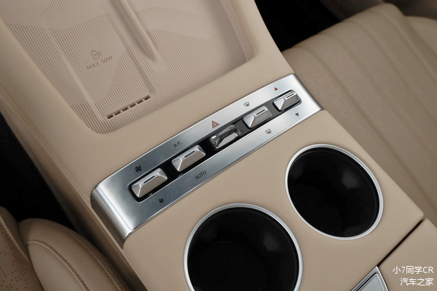 在舒适便利性方面的设计也比较贴心,我体验的“220km 电七座旗舰版”提供了:6.4L扶手箱冷暖冰箱(温度调节范围为-6~50℃,能容纳8听可乐,最近几天我所在的南京地区气温在零下,加热奶茶100公里路程后依然温热,还带有紫外线杀菌功能,离车后可保温24小时左右,通过车机即可调控)、二排副驾后方折叠小桌板(可承重30公斤,带有凹槽设计,孩子在上面写作业、大人临时处理工作或放置零食饮料都比较稳固)。