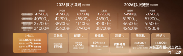 1 月 10 日,奇瑞新能源 “潮有料开麦夜” 暨 2026 款冰淇淋上市发布会圆满举行,26 款新车携四大版本正式登场。甜趣版 3.4 万起、英伦版 3.56 万起、竞速版 3.79 万起、女王版 3.87 万起,同步推出的全新 小蚂蚁 271km 版本 4.26 万起,价格亲民。限时可享增购 3000 元补贴、置换 / 报废最高 12% 厂家补贴,叠加 3 年 0 息、终身质保等权益,用车成本大幅降低。