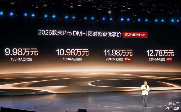 1月10日,比亚迪正式宣布2026款宋Pro DM-i上新220km长续航版本,全系限时超级优享价9.98万元-12.78万元。