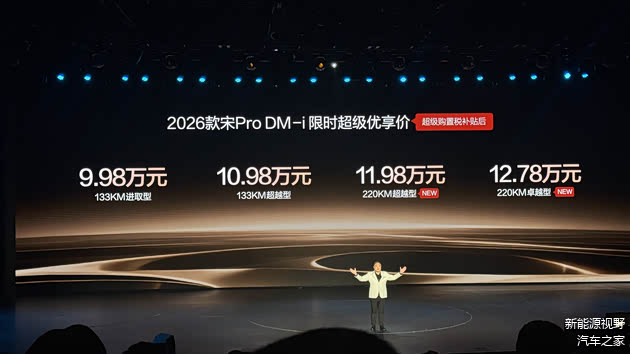 2026年1月10日比亚迪2026款 宋 Pro DM-i正式上市,新车共推出4款车型,限时超级优惠价9.98万元--12.78万元。动力上,搭载第5代DM-i混动技术,纯电续航提升至220km,综合续航里程提升至1600km。