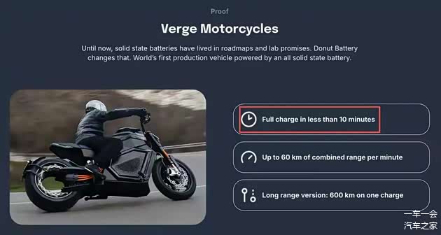 据介绍,Donut Lab公司这款全固态电池将率先搭载于芬兰摩托制造商Verge Motors的TS Pro和Ultra电动摩托车上,首批新车的交付将于今年第一季度开始,起售价29900美元,约合人民币20.86万元。根据官网介绍,搭载全固态电池的TS Pro摩托车最高续航约600km,充电时间被控制在10分钟以内。而在此前,搭载传统锂离子电池时,TS Pro摩托车的续航只有217英里,约350km。
