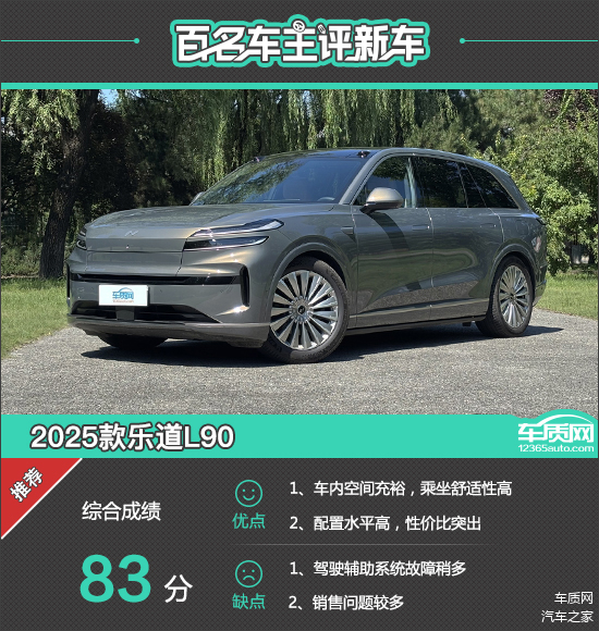 在收集到的103份有效问卷中,根据车主对2025款乐道L90在车型基本面、驾乘感受、使用成本以及质量可靠性、售前/售后服务方面给出的真实评价,在此次调查中2025款乐道L90的综合得分为83分,达到了车质网的推荐标准。