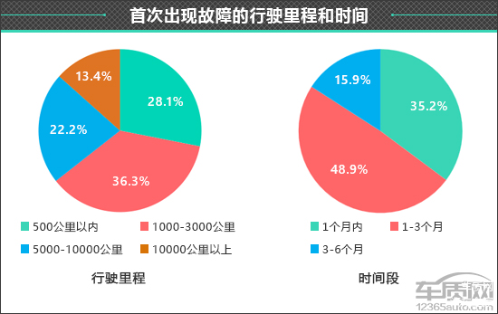 在这些出现非人为故障的车辆中,首次故障出现在行驶里程在1000-3000公里以内的占比相对较高,为36.3%;其次是行驶里程在500公里以内出现故障的车辆,占比为28.1%。而对于首次出现故障时间段的调查结果显示,有48.9%的受访车主表示车辆首次故障出现在购车1-3个月内。