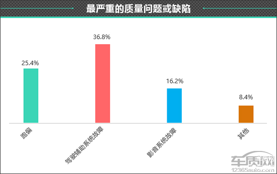 在对车主的进一步调查中我们发现,车身附件及电器出现非人为故障的占比相对较高,这也体现在“这款车最严重的质量问题或缺陷”调查结果中。经调查发现,车主在“驾驶辅助系统故障”方面的问题抱怨最多,占比为36.8%。