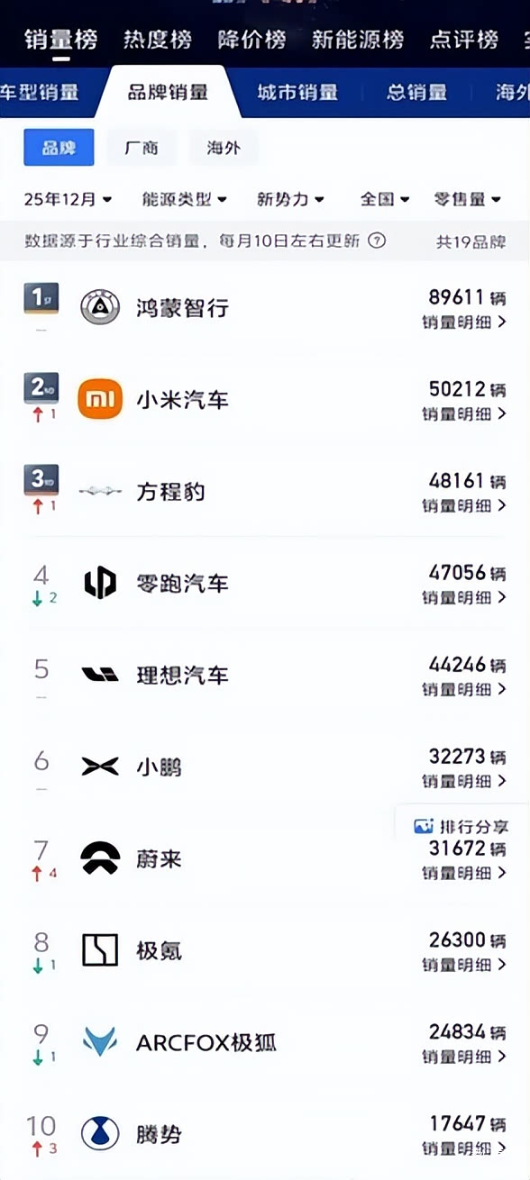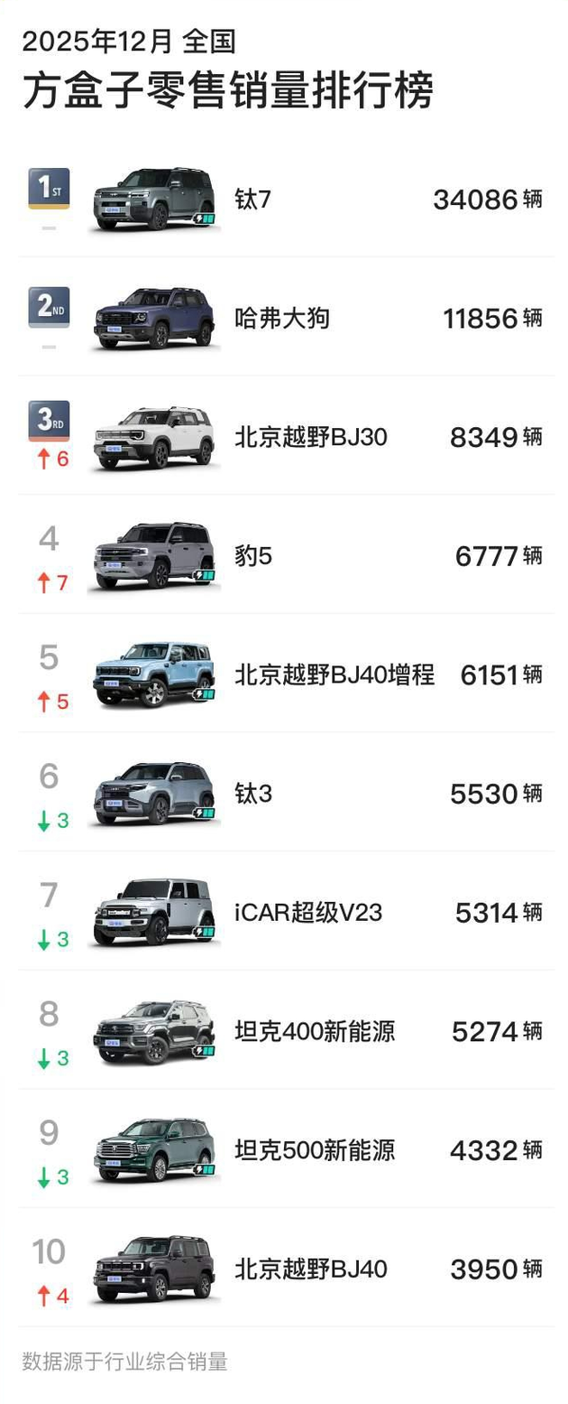 得益于旗下多款冠军车型的出色市场表现,方程豹品牌在12月实现全系销量达50,868台,环比增长36%,同比暴涨345.5%,单月销量首次突破五万大关,并成功跻身新势力品牌月度销量TOP3,展现出强劲的市场爆发力。