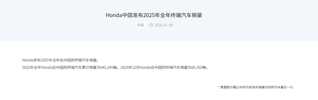 根据本田中国发布的官方数据,2025年全年在华终端汽车累计销量为645,345辆,与上年同期相比大幅下滑24.28%。