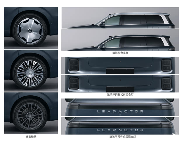 D19的整备质量为2730-2760kg,配备265/45 R21的轮胎规格,有三种不同的轮毂样式,其中“迈巴赫风格花瓣轮毂”应该是最高配的双色版本专属。零跑可能也知道D19在车重上要比同级别车型多出50kg左右,给到265 的胎宽就很合适。