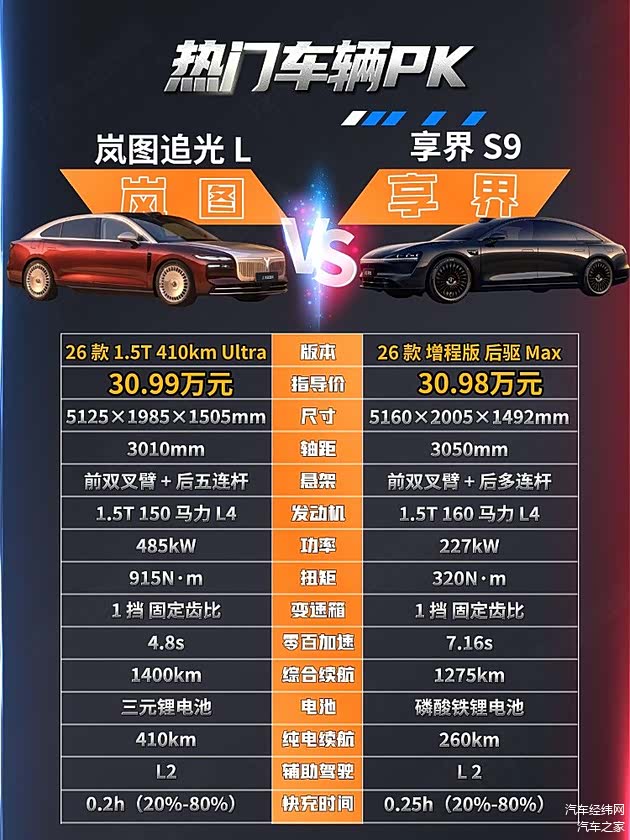 岚图追光L 2026款 四驱Ultra指导价为30.99万元,享界S9 2026款 增程 Max 后驱 37kWh指导价30.98万元,两款车型价格相近,定位亦有一定重叠。接下来,我们将从多个维度进行对比,看看哪一款车的表现更胜一筹。