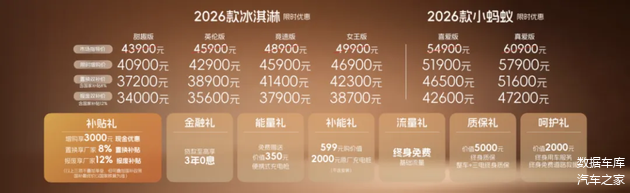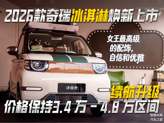 1 月 10 日,奇瑞新能源在芜湖举行上市活动,正式推出 2026 款冰淇淋系列,包含 26 款配置车型及同步升级的全新 小蚂蚁,进一步完善微型纯电产品布局。
