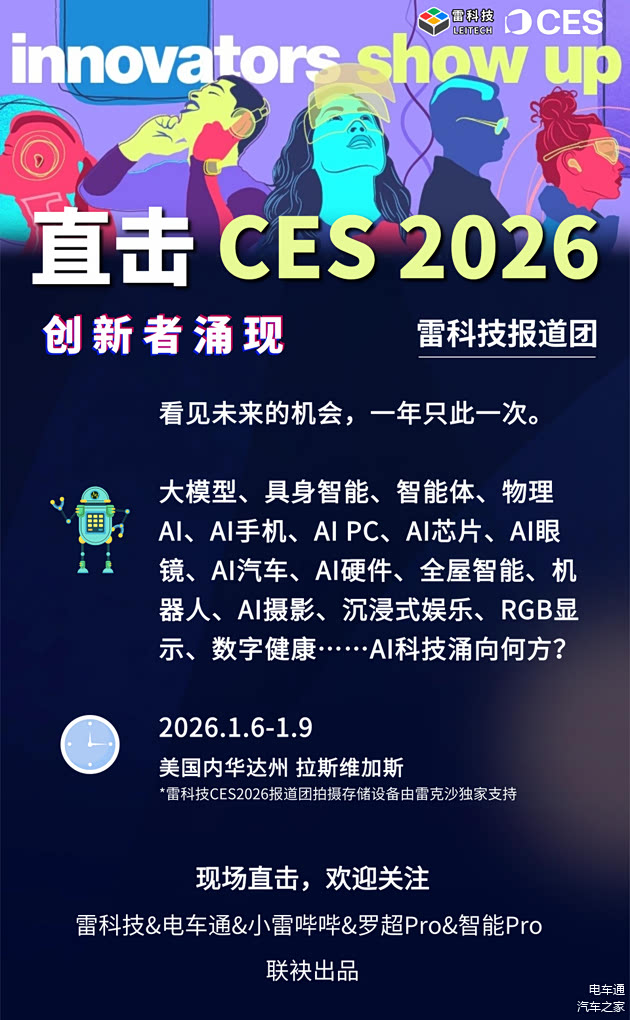 雷科技史上规模最大CES报道团已集结美国拉斯维加斯现场,后续将通过深度观察、高端对话、技术解析、新品体验、探展Vlog等形式立体呈现CES2026上的科技创新。我们也将会特别关注中国品牌在CES上的动态,立体呈现世界舞台上的中国科技力量,敬请期待。