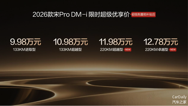 2026年1月10日,比亚迪正式宣布2026款宋Pro DM-i上新220km长续航版本,全系限时超级优享价9.98-12.78万元。