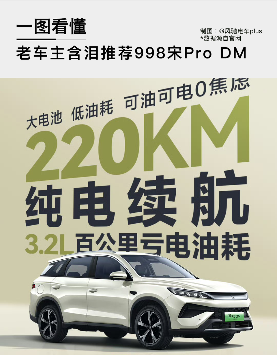 一图看懂! 老车主含泪推荐998宋Pro 老车主的泪都要哭干了 2026款220km续航的宋pro 上了26.6k度电池 220公里纯电续航 还上了TBC爆胎辅助 连充电速度都变成54Kw 看看这一个又一个新车 老车主是不是都盼着怎么全损呢