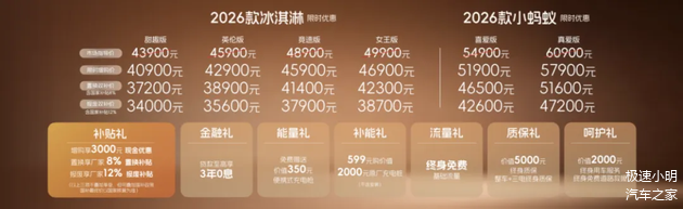 同时,全新小蚂蚁也同步推出271km喜爱版与271km真爱版两款车型,续航由251km提升至271km,真爱版售价47200元起、喜爱版售价42600元起,进一步丰富奇瑞新能源在微型纯电市场的产品矩阵。