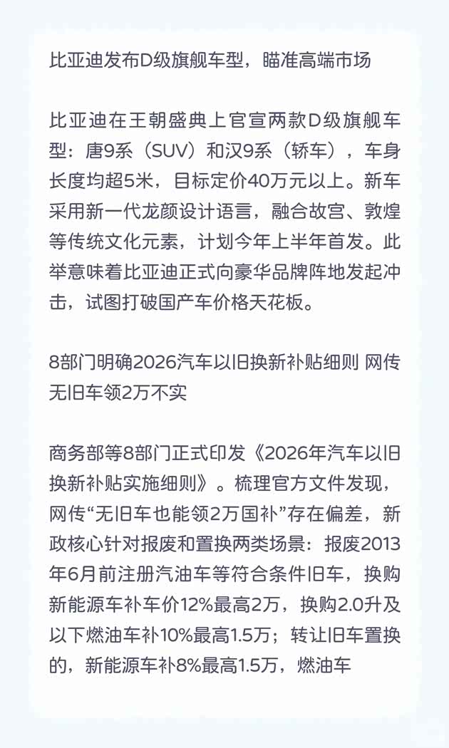 比亚迪在王朝盛典上官宣两款D级旗舰车型:唐9系(SUV)和汉9系(轿车),车身长度均超5米,目标定价40万元以上。新车采用新一代龙颜设计语言,融合故宫、敦煌等传统文化元素,计划今年上半年首发。此举意味着比亚迪正式向豪华品牌阵地发起冲击,试图打破国产车价格天花板。