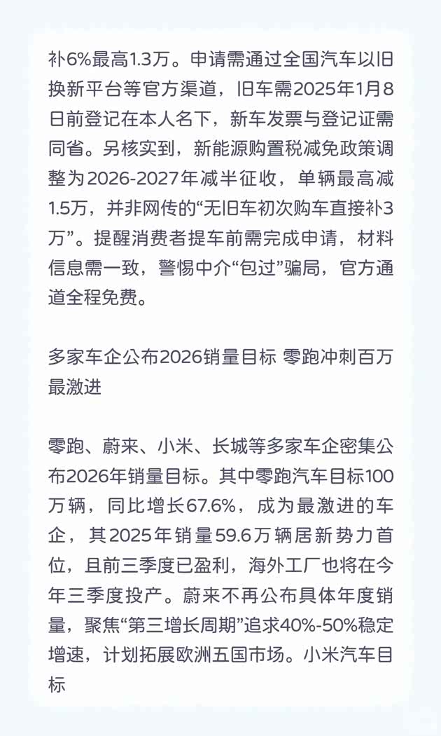 多家车企公布2026销量目标 零跑冲刺百万最激进