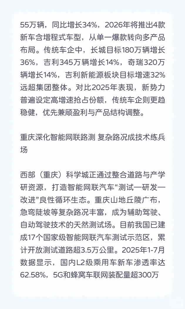 零跑、蔚来、小米、长城等多家车企密集公布2026年销量目标。其中零跑汽车目标100万辆,同比增长67.6%,成为最激进的车企,其2025年销量59.6万辆居新势力首位,且前三季度已盈利,海外工厂也将在今年三季度投产。蔚来不再公布具体年度销量,聚焦“第三增长周期”追求40%-50%稳定增速,计划拓展欧洲五国市场。小米汽车目标55万辆,同比增长34%,2026年将推出4款新车含增程式车型,从单一爆款转向多产品布局。传统车企中,长城目标180万辆增长36%,吉利345万辆增长14%,奇瑞320万辆增长14%,吉利新能源板块目标增速32%远超集团整体。对比2025年表现,新势力普遍设定高增速抢占份额,传统车企则更趋稳健,优先兼顾盈利与产品结构调整。