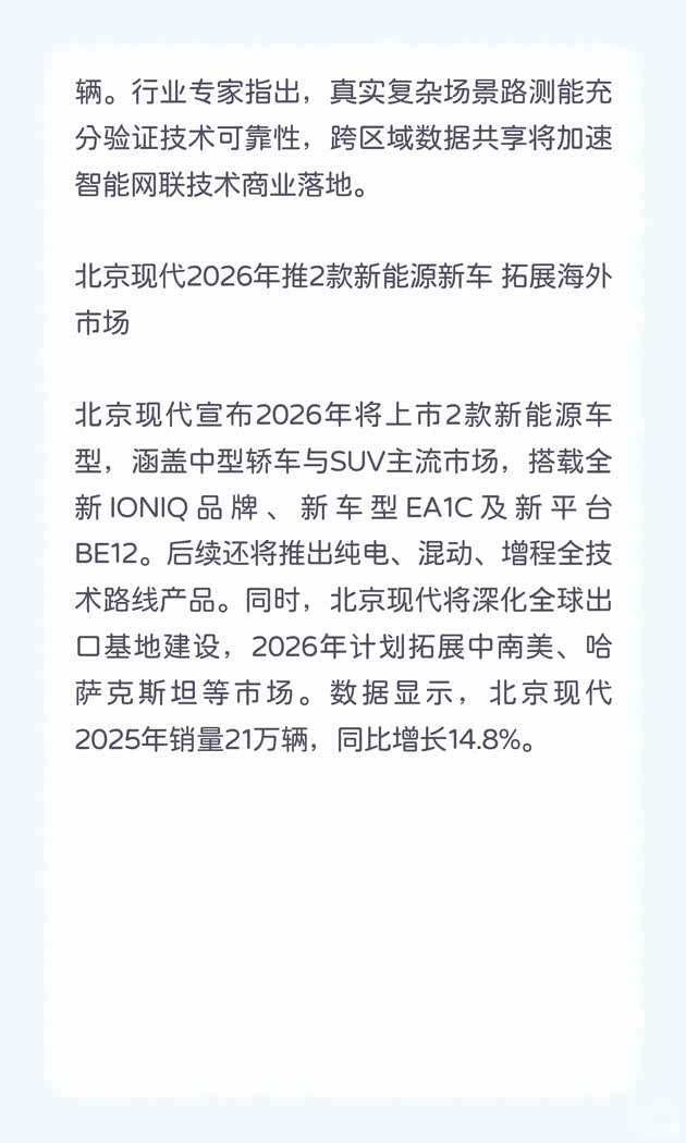 北京现代宣布2026年将上市2款新能源车型,涵盖中型轿车与SUV主流市场,搭载全新IONIQ品牌、新车型EA1C及新平台BE12。后续还将推出纯电、混动、增程全技术路线产品。同时,北京现代将深化全球出口基地建设,2026年计划拓展中南美、哈萨克斯坦等市场。数据显示,北京现代2025年销量21万辆,同比增长14.8%。