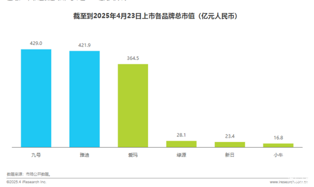 在产业布局上,2025年头部企业的高度集中的趋势显着增强,到2025年的四月,九号公司以其429亿元的市场价值稳居行业榜首,而雅迪则紧随其后,达到421.9亿元,这两家企业共同构成了行业的顶级行列。雅迪的成绩出现“爆炸性”增长,在进一步巩固其作为龙头企业地位的同时也使整个行业内的市场竞争态势变得更加清晰。
