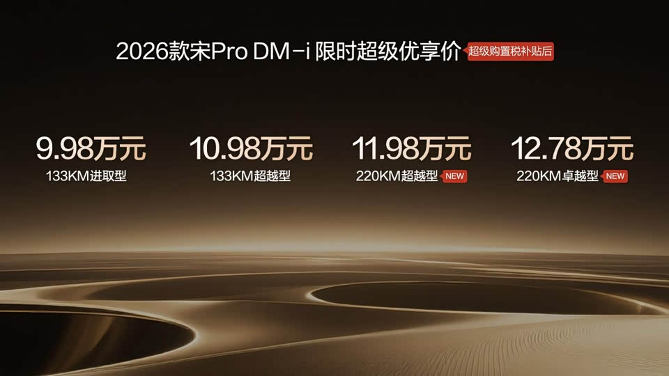 1月10日,比亚迪2026款宋Pro DM-i上新220km长续航版本,全系限时超级优享价9.98-12.78万元。 此次上新的2026款宋Pro DM-i长续航版车型,最大亮点是CLTC工况下纯电续航提升至220公里,同时推出了星河米以及翠峰绿两种新颜色。2026款宋Pro DM-i 220km版与好孩子联合开发的智能儿童安全座椅,支持车机互联与语音控制,可实现上车自动旋转迎宾。同时,车内还融合了倍轻松智能颈部按摩仪与智能眼罩,通过车机或语音即可一键启动。配置上,新车新增一体式智能冷暖冰箱、前排座椅通风加热、感触式广角全景天窗、31 色环抱式情景氛围灯。智能辅助驾驶方面,2026款宋Pro DM-i 220KM版搭载的“天神之眼C-辅助驾驶系统”。此外,2026款宋Pro DM-i新增了高速爆胎稳定控制系统。爆胎的危急瞬间,通过对驱动轮和制动系统的协同控制,有效抑制车辆跑偏与失控,将车辆稳定地减速至安全状态。