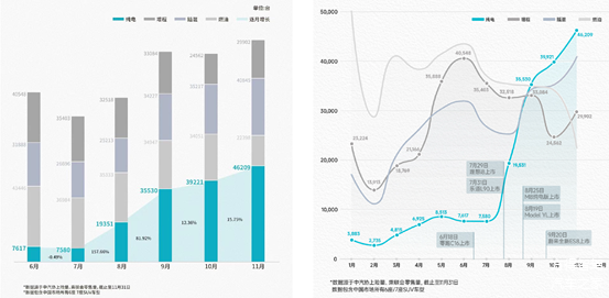 图:2025年6月到11月大三排SUV销量按动力形式分布