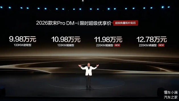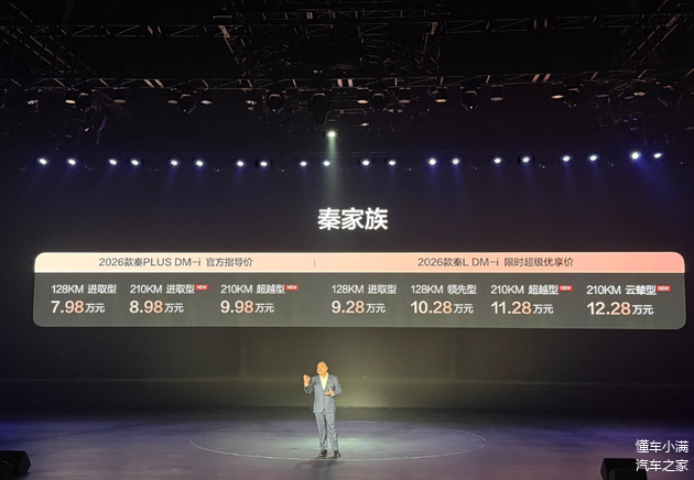 咱们先以秦家族为例, 秦PLUS DM-i至今仍是紧凑型轿车市场的销量标杆,这次2026款将提供三款配置可选,指导价区间为7.98-9.98万元,只能说一如既往的亲民,因为入门版车型的纯电续航里程也提升至128km,中高配车型更是达到210km。另外就像刚才所说,原本10万级以内的混动车型普遍是纯电续航100km左右,现如今秦PLUS DM-i直接来到210km,哪怕是每天通勤三四十公里,一周一充也不再是问题,所以这次2026款其它地方没有任何改动也无所谓,就这一招足以让竞品无还手之力。