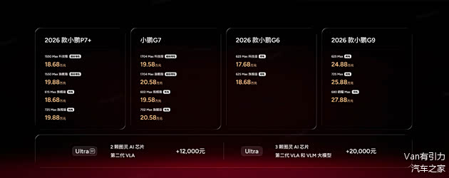有一说一,这4款车型的价格没啥惊喜,起步价跟2025款完全一致。不过由于部分车型对具体版本进行了调整,价格上限有所降低。小鹏方面表示,如在3月31日前下定2026款P7+、 小鹏G7 以及G6 全系,可享受8000元新春购车补贴、每年 1500 度电卡(6年)复购权益以及金融方案、选装基金等购车礼遇。如下定G9 全系,新春购车补贴则有12000元之多。