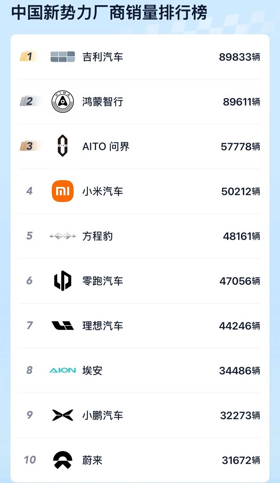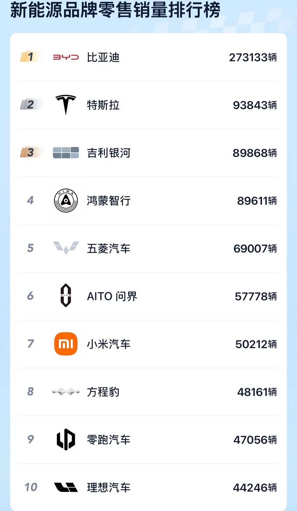 2025年12月新能源品牌零售销量排行榜,比亚迪以273133的绝对优势排在第一。特斯拉排在第二,但是销量不足10万,具体数据位93843。吉利银河、鸿蒙智行、五菱汽车排在3-5位,销量分别为89868、89611、69007。问界和小米汽车排在6、7位,销量均超5万。方程豹、零跑汽车、理想汽车名列8-10位。 2025年12月新势力品牌月销榜,吉利银河、鸿蒙智行和问界排名前三,小米憾居第4,方程豹位居第5。零跑汽车、理想汽车、埃安、小鹏、蔚来分列6-10位。