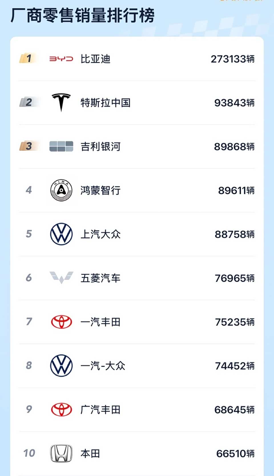 2025年12月厂商零售销量排行榜,比亚迪、大众、丰田排名前三,比亚迪销量超27万,大众销量超16万,丰田超14万。特斯拉、吉利银河、鸿蒙智行排在4-6位,五菱汽车、本田、奥迪、问界均进入前10,奇瑞、长安、吉利汽车、小米汽车、日产销量均超5万,但未能进入前10。