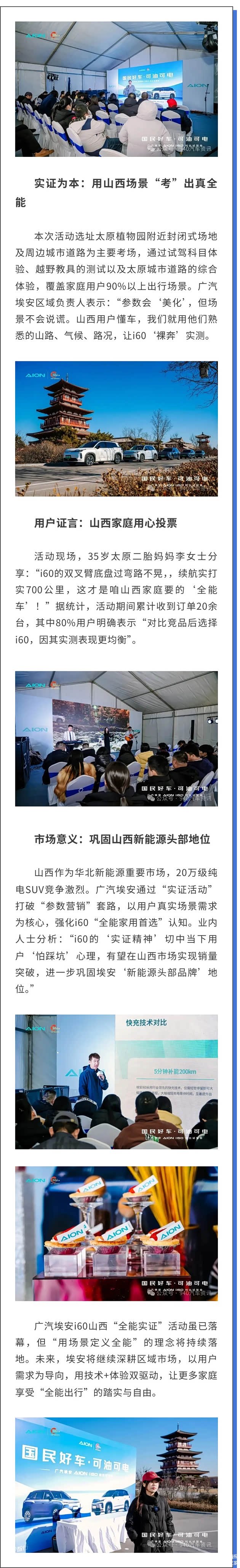 1月11日广汽埃安在山西太原启动“国民好车·可油可电广汽埃安 AION i60 对比试驾会”,通过多种试驾体验活动,以综合试驾科目和太原综合道路为考场,特邀零跑C11、比亚迪宋PLUS同台竞技,以太原本地用户真实需求为出发点,重点验证i60在续航、智能座舱及驾控性能的综合优势。 活动现场吸引200+山西家庭用户参与,实测数据显示:i60在续航达成率、智驾覆盖率、底盘稳定性等维度全面领先零跑C11、比亚迪宋PLUSL,树立“全能家用”新标准。