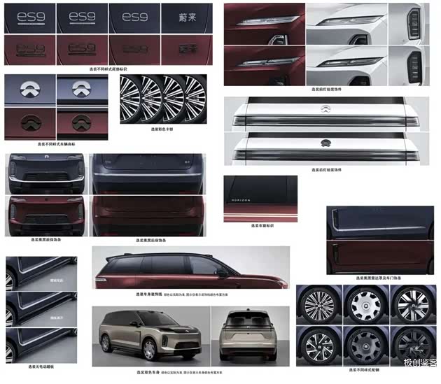 从申报图可见,ES9延续蔚来家族式设计语言,但细节优化更凸显旗舰气场。前脸配备标志性的Double-dash分体式矩阵大灯,造型锐利有神,搭配封闭式格栅与可发光品牌LOGO,科技感与豪华感兼具;前包围贯穿式饰条上移,与侧包围形成一体式布局,比ES8更显厚重沉稳。车身侧面线条平直硬朗,隐藏式门把手优化风阻,搭配21-23英寸多规格轮毂,其中23英寸“大饼轮毂”造型极具视觉冲击力,轮眉黑化饰条进一步强化运动质感。