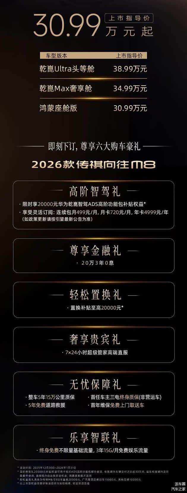 2025年12月30日,正值传祺M8上市八周年之际,2026款传祺向往M8感恩上市,新车上市指导价30.99万元起,限时补贴价仅28.99万元起。为回馈广大用户的长期信赖与支持,即日起下订即可尊享六大专属礼包:置换补贴至高20000元、限时享20000元华为乾崑智驾ADS高阶功能包补贴权益,以及20万3年0息金融礼等丰厚权益。