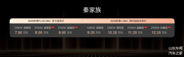 此次,2026款秦PLUS DM-i三款车型售价7.98万元-9.98万元;2026秦L DM-i四款车型限时超级优享价9.28万元-12.28万元;2026款宋Pro DM-i限时超级优享价9.98万元-12.78万元。