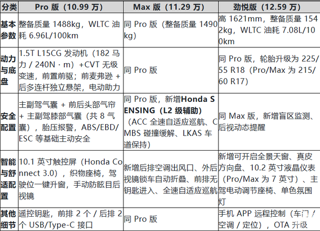 - 安全配置强化:Max 版及以上新增 L2 级 Honda SENSING(老款仅顶配可选),Pro 版标配 8 气囊(老款为 6 气囊),安全性追上同级主流水平;