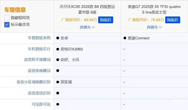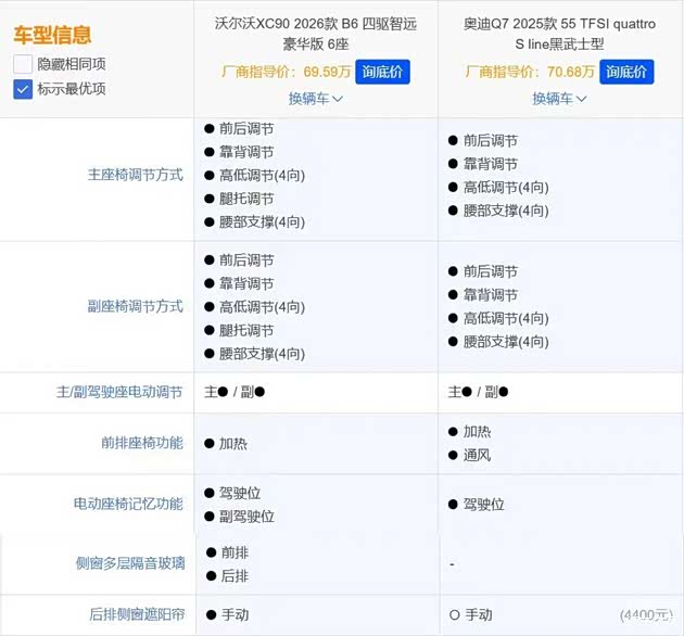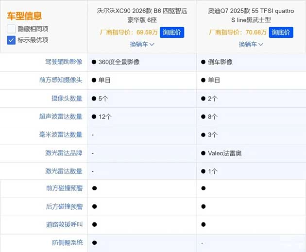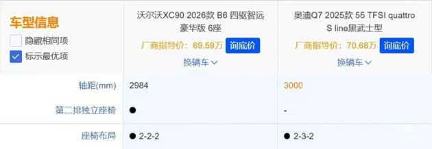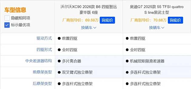 为了让大家更直观了解两款车的差异,我们选取了指导价为69.59万元的沃尔沃全新XC90 2026款 B6 四驱智远豪华版 6座(下文简称:沃尔沃全新XC90),以及指导价为70.68万元的奥迪Q7 2025款 55 TFSI quattro S line黑武士型(下文简称:奥迪Q7),用这两款车来做对比。