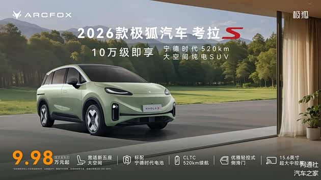 1月13日,2026款极狐汽车考拉S正式上市,共推出520 AIR、520 PRO、520 MAX三个版型,售价9.98万-11.98万元。同时,新车给出“8年或15万公里电池衰减超限值只换不修、电池自燃烧一赔一、三电终身质保”三重守护承诺,更诚意放送“价值3999元充电桩抵扣券、5年或12万公里整车质保、终身免费OTA升级”等6大尊享权益。
