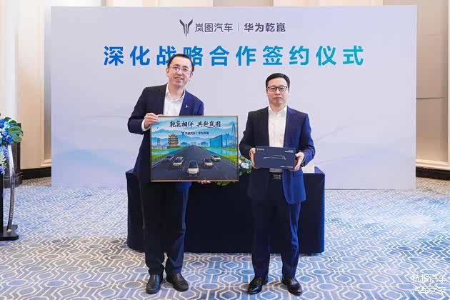 (岚图汽车与华为引望签署战略深化合作,岚图汽车董事长、党委书记卢放向引望CEO靳玉志赠送岚图泰山车模)