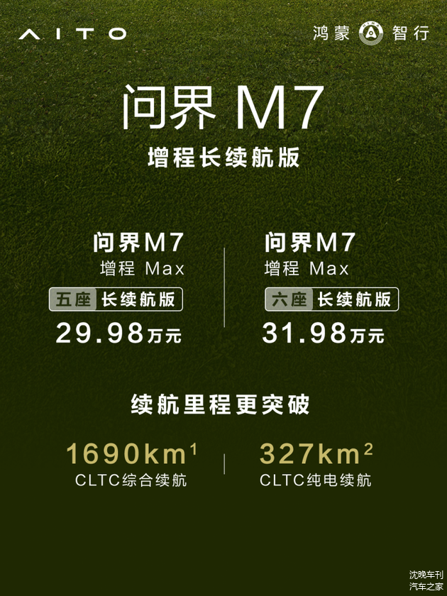 同日,全新问界M7增程长续航版正式上市,其中增程Max五座长续航版售价29.98万元,增程Max六座长续航版售价31.98万元,即刻下定,可享受至高60000元购车权益。