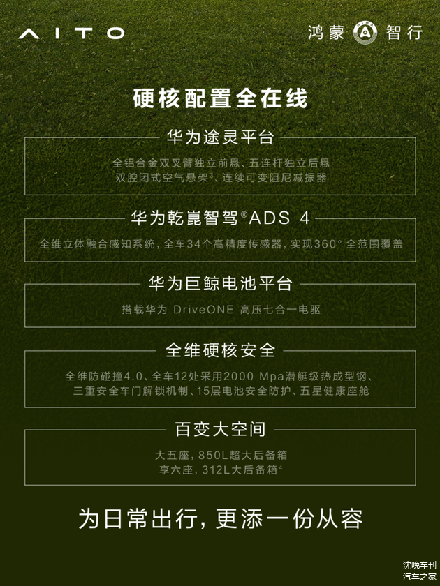 值得关注的是,全新问界M7增程长续航版悉数保留了在售车型的核心配置,硬核配置全面在线。华为途灵平台搭载全铝合金双叉臂独立前悬、五连杆独立后悬、双腔闭式空气悬架、连续可变阻尼减振器,兼顾舒适性与驾控质感;华为乾崑智驾ADS 4辅助驾驶系统配合34个感知硬件,可实现对动静态目标(含异形物体)的全场景和全天候感知,提升雨雾尘恶劣天气的安全性,以及对后向悬浮物、负向场景的识别,实现360度全覆盖;三电系统基于华为巨鲸电池平台打造,搭载华为DriveONE高压七合一电驱系统;全维防碰撞4.0显著提升行车安全,全天候守护用户驾乘全程。