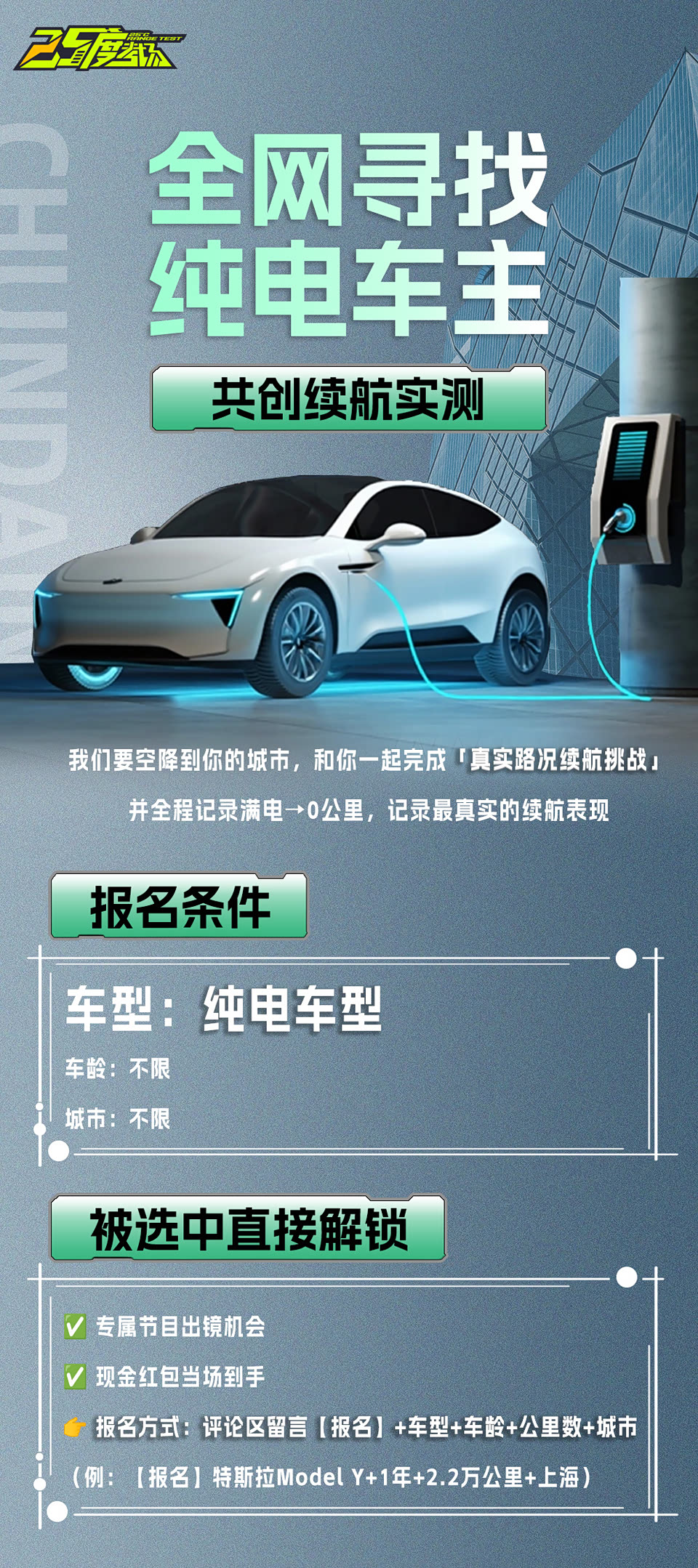 👉 报名方式:评论区扣【纯电报名】+ 你的车型与公里数+所在城市