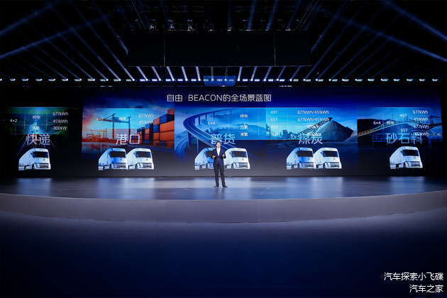 以福田卡文重卡BEACON为例,基于独创的一体化平台,独创跨平台、可拓展、高集成的动力底盘一体化架构,实现氢电共平台与高集成承载。