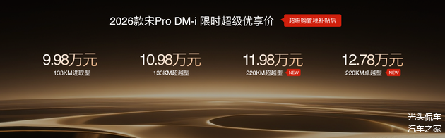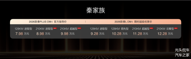 此次,2026款秦PLUS DM-i三款车型售价7.98万元-9.98万元;2026秦L DM-i四款车型限时超级优享价9.28万元-12.28万元;2026款宋Pro DM-i限时超级优享价9.98万元-12.78万元。