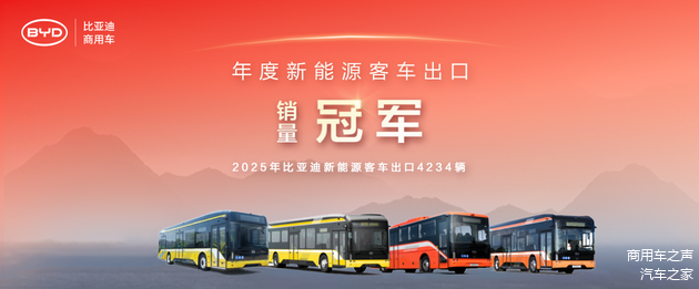 据中国客车统计信息网最新数据显示,2025年,比亚迪以新能源客车出口4234辆、同比增长18.2%、市场份额24%的亮眼成绩,再次斩获年度冠军,是唯一出口新能源客车超过4200辆的企业,比亚迪已连续三年稳居该榜单首位。