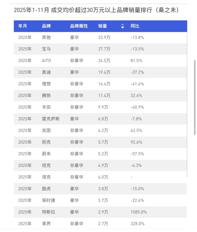 2025年1-11月,在成交均价超过30万元的品牌销量排行中,奔驰以33.9万辆位居第一,其后依次为宝马(27.7万辆)、AITO(24.5万辆)和奥迪(19.6万辆)。